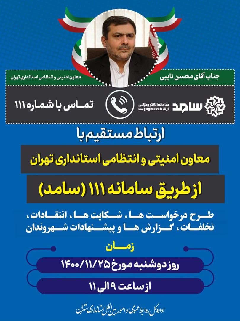 شهروندان محترم شهرستان میتوانند از طریق سامانه سامد (تلفن 111) مسائل و مشکلات خود را با ایشان در میان بگذارند.